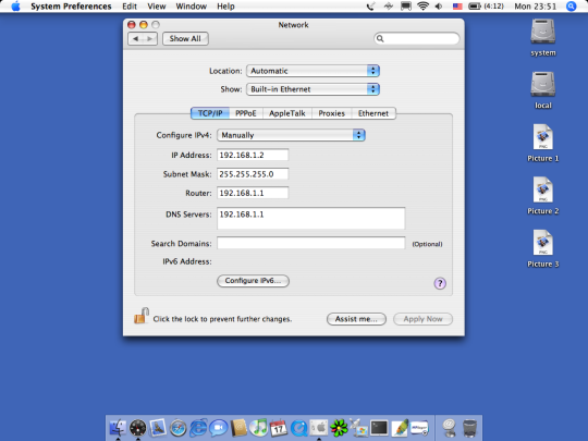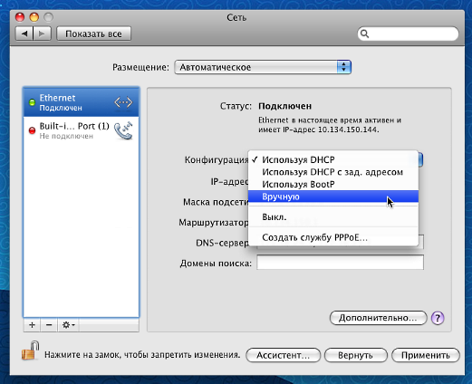 4. На вкладке TCP/IP укажите способ настройки IP-адреса: Вручную (Manually) и в диалоговом окне укажите IP-адрес (IP Address). Необходимо также ввести данные о маске подсети (Subnet mask) , адрес шлюза по умолчанию (Router) и адрес сервера имен (DNS), которые вы найдете в договоре.