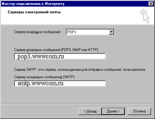 Настройка программы MS Outlook ExpressПрограмма Outlook Express обычно уже установлена на вашем компьютере. Далее мы рассмотрим процесс настройки прогораммы для работы с Вашей почтой. Для настройки почтового ящика вам понадобятся следующие данные:Имя пользователя (login), Пароль (password), Ваш адрес элктронной почты вида yourname@wwwcom.ru (Ваш e-mail записан в контракте). 1. Запустите программу Outlook Express выбрав иконку с этой программой на рабочем столе или найдя ее в меню Пуск. 2. При первом обращении автоматически активируется мастер подключения к интернету. Если этого не произошло, запустите Мастер настройки почтового ящика из меню "Сервис -> Учётные записи -> Добавить -> Почта". На первом экране Мастера введите ваше имя, которым будут подписываться все исходящие письма и нажмите "Далее". ![]() 3. Далее укажите ваш адрес электронной почты (e-mail) и также нажмите "Далее". ![]() 4. Укажите сервер входящих сообщений (POP3) - pop3.wwwcom.ru и сервер исходящих сообщений (SMTP) - smtp.wwwcom.ru и также нажмите "Далее". ![]() 5. Далее укажите имя Вашей учетной записи (первая чать e-mail) и пароль, для сервера входящих сообщений. Остальные параметры рекомендуется оставить без изменений и перейти к следующему экрану, нажав кнопку "Далее". ![]() 6. Нажмите кнопку "Готово" для сохранения настроек учетной записи. ![]() 7. Перед Вами появится интерфейс программы, для дальнейшего изучения которого рекомендуем обратиться к встроенной справке. ![]() |