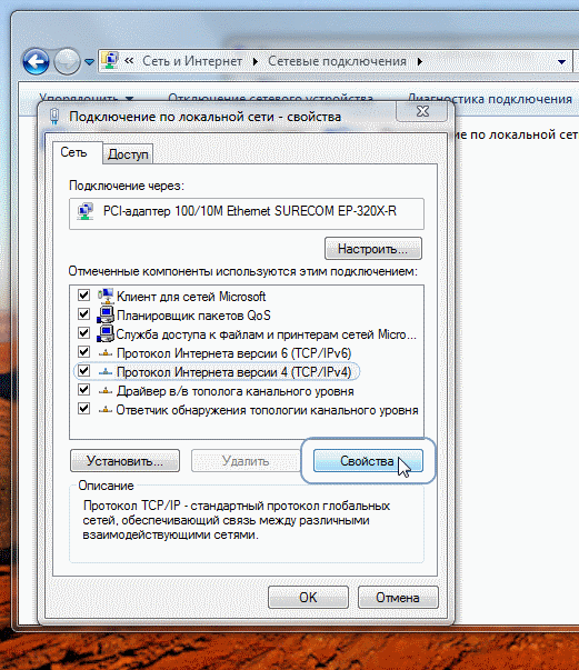 5. В диалоговом окне свойств кликните по пункту "Протокол Интернета версии 4 (TCP/IPv4)" и нажмите кнопку Свойства