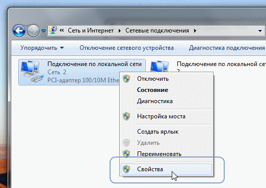 4. В появившемся окне "Сетевые подключения" кликните правой кнопкой мыши по значку "Подключение по локальной сети" и выберите пункт Свойства