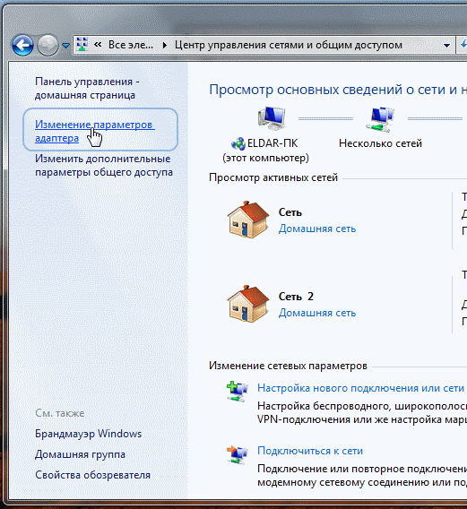 3. В списке слева выберите пункт "Изменение параметров адаптера"